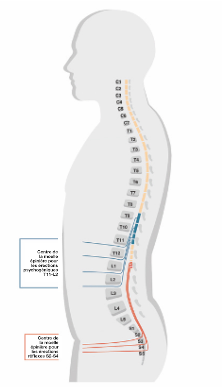 La moelle épinière a deux zones qui ont un impact sur les érections (voir ci-dessous). La façon dont elles affectent les érections dépend de l’emplacement de votre lésion. Cela dépend également de la perte totale ou partielle des fonctions situées sous la LMÉ (lésion complète ou incomplète). En cas de lésions incomplètes, les cas individuels doivent être pris en considération, car il existe de nombreuses variantes possibles.