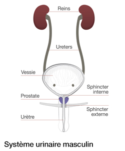 Les sphincters sont deux muscles annulaires (appelés les sphincters interne et externe) qui entourent l’urètre. Le sphincter externe est celui qui est contracté volontairement pour contrôler le moment où vous urinez.