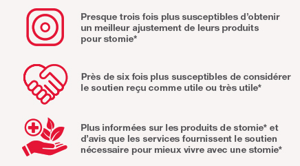 Les programmes de soutien aux personnes stomisées ne remplacent pas les soins que vous recevez de votre professionnel de la santé de soins de santé. Ils peuvent toutefois devenir un précieux complément de l’équipe de professionnels, offrant de l’information, des conseils sur les produits et de l’écoute lorsque le besoin s’en fait sentir. Les programmes de soutien ne sont pas tous équivalents. Alors, assurez-vous de consulter ceux qui vous sont présentés pour obtenir des précisions sur les services offerts.