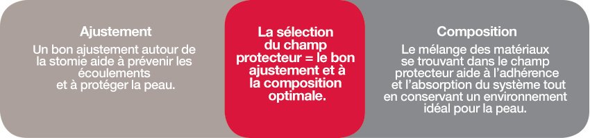 Avoir le bon champ protecteur peut faire la différence dans la capacité de votre peau à maintenir son niveau d’humidité. Garder en tête l’importance de la composition et de l’ajustement et consultez votre infirmière spécialisée en soins de stomies si vous remarquez des irritations ou des rougeurs autour de votre stomie.