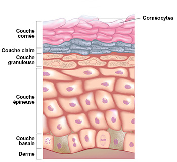 La partie la plus visible de la peau est l’épiderme, qui est divisé en cinq couches. L’épiderme est relativement mince, mais dur. Il est principalement constitué de cellules appelées kératinocytes qui migrent lentement vers la surface, où ils sont jetés et remplacés par de nouvelles cellules qui viennent d’en dessous. Cette couche supérieure de l’épiderme s’appelle la couche cornée.
