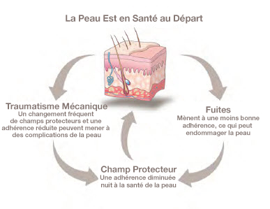 L’écoulement de stomie est corrosif pour la peau. Cela peut donc faire en sorte que l’ajustement du champ protecteur est encore plus difficile à effectuer. Si votre appareillage n’est pas bien ajusté autour de votre stomie, une fuite peut en résulter. Une mauvaise adhérence peut également conduire à des fuites et à des lésions cutanées. Une mauvaise adhérence ou un champ protecteur mal installé peut entraîner des changements de champ protecteur très fréquents, ce qui peut conduire à une irritation de la peau. Cela devient un cercle vicieux qui devient plus difficile à résoudre en raison de la gravité de la complication de la peau péristomiale.